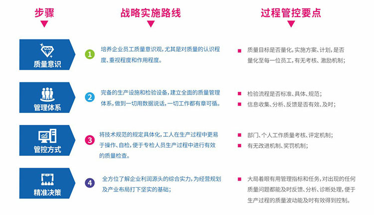 制程管理战略涵盖:来料检验分析、LQC生产检验缺陷采集、PQC功能测试缺陷采集、OQC出货检验缺陷采集、抽检加严、DPPM缺陷分析、SPC分析、制程品质能力评估等。